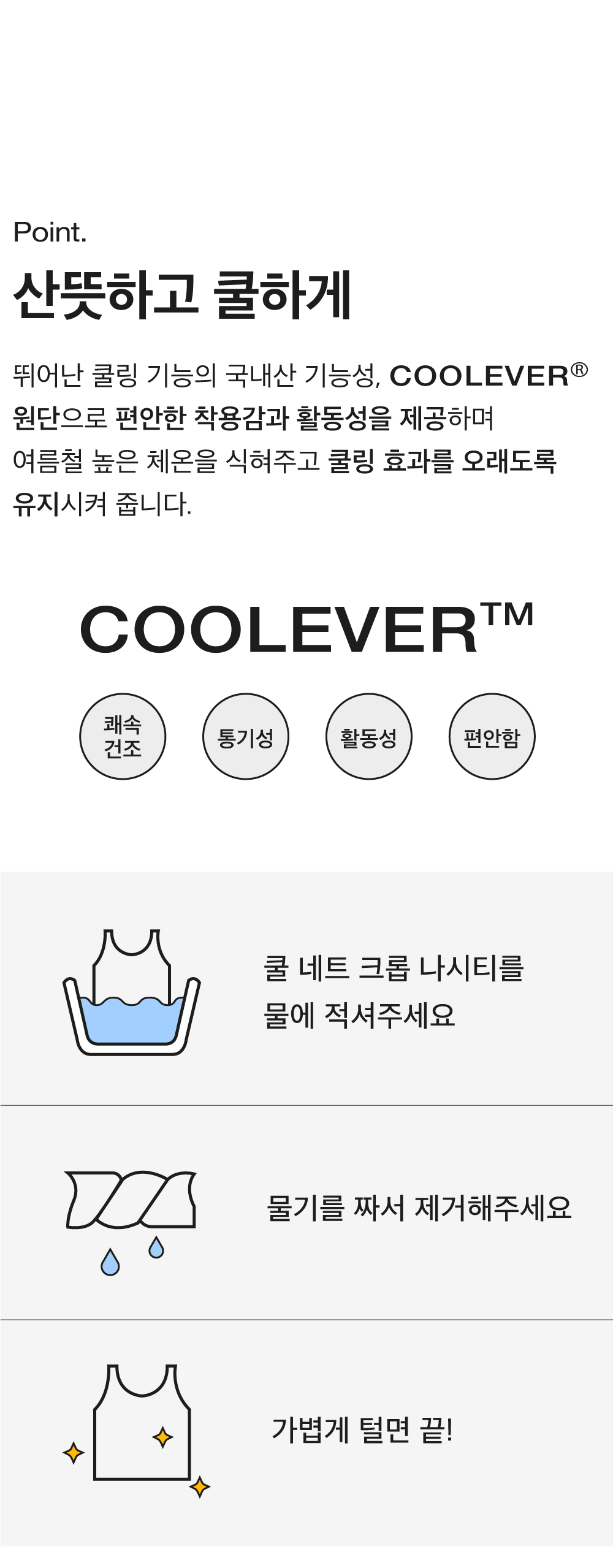 햇빛을 많이 받는 등판은 쿨링기능이 뛰어난 쿨에버 원단으로, 가슴판은 반전매력을 선사할 시원한 그물 망사로 구성되어있습니다.