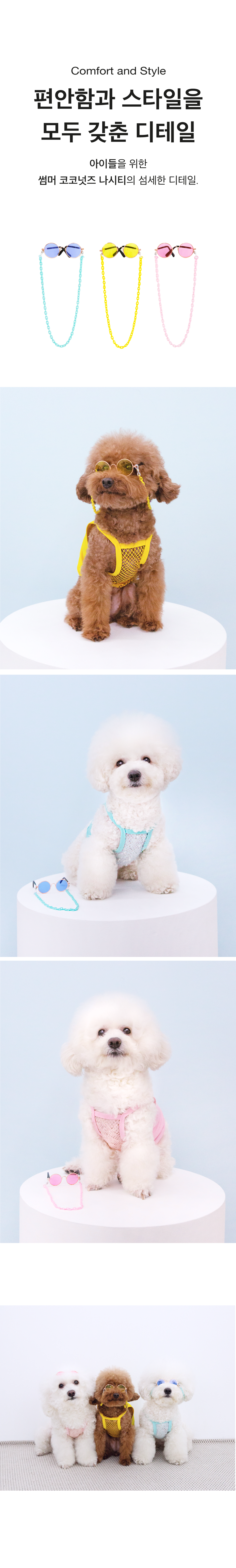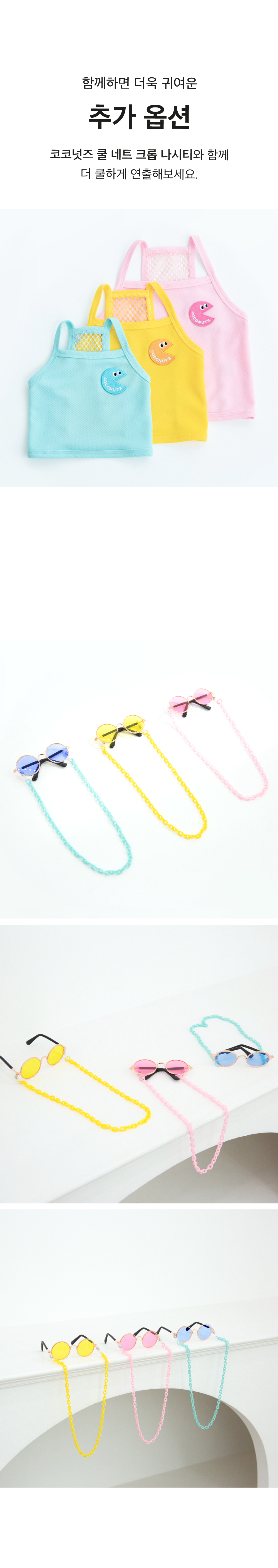 도글라스와 같은 톤의 체인 스트랩으로 더욱 비비드하고 힙하게! 쿨 네트 크롭 나시티와 함께 착용하면 귀여움이 두배에요.
