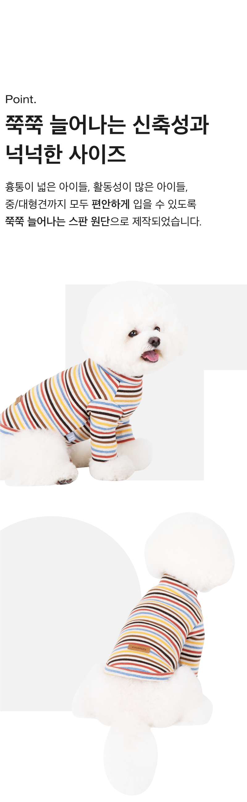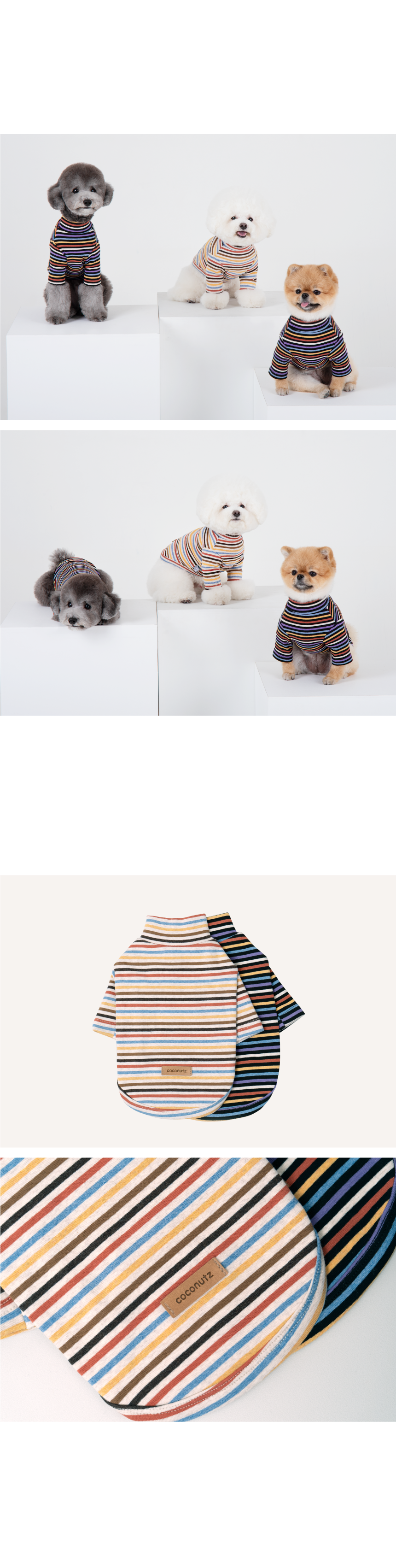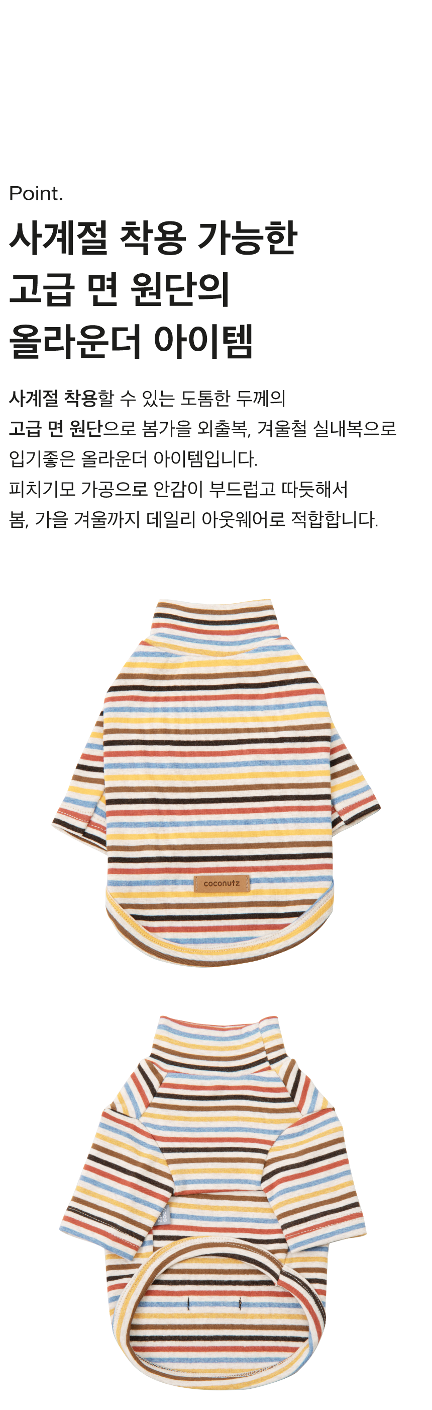 어텀무드의 6색 줄무늬가 배치된 레트로한 컬러의 폴라 티셔츠입니다. 신축성 좋은 보드라운 피치기모 원단으로 가을,겨울 실내외 데일리룩으로 적합합니다.